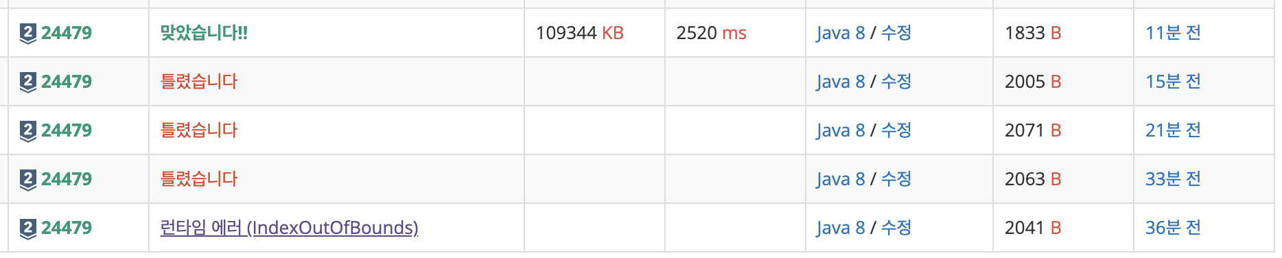 처음엔 반복문 크기를 잘못 지정해서 런타임 에러가 떴고, 그것만 틀린 줄 알고 바로 제출 했는데 74%? 까지 올라가다가 틀다는 문구가 떴다.. 맞힌 줄 알았는데 😭